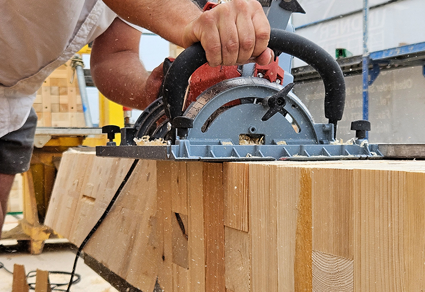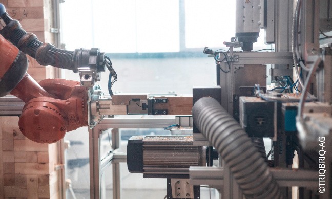 In Tübingen fertigen Industrie-Roboter die BRIQs entlang eines patentierten Dübelsystems. Die flexible, skalierbare Produktion verwandelt minderwertiges Holz in einen hochwertigen, kreislauffähigen Baustoff.