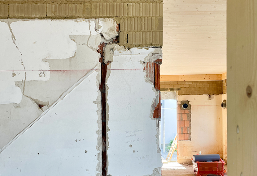 Der Umbau nimmt Form an! Das Erdgeschoss wurde fertig gemauert – bestehende Wände ergänzt durch Ziegel- und Lehmsteine. Neue Innenwände entstanden größtenteils aus den ökologischen Lehmsteinen der Firma Schlagmann sowie den Holzbausteinen von Triqbriq. Besonders schön: Sowohl Lehmwände als auch TriqBriq-Wände bleiben teilweise bewusst unverputzt – denn die verwendeten Baustoffe sollen erlebbar sein.