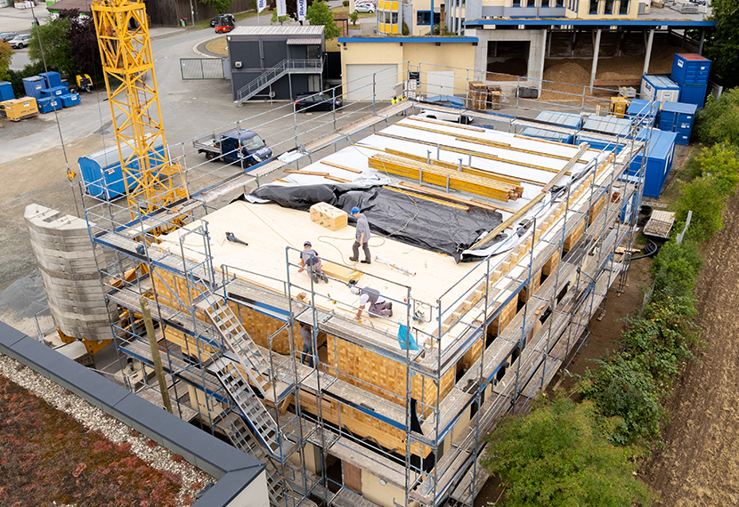 Die neue Holzgeschossdecke wurde zügig montiert – die Holzmodule ließen sich schnell einheben und wurden mit mehreren Hundert Schrauben fixiert. Die Fensterstürze bestehen aus dem alten Holz des ursprünglichen Dachstuhls – Wiederverwendung im besten Sinne! Das neu aufgestockte Obergeschoss wurde ebenfalls aus TriqBriq-Holzbausteinen errichtet.