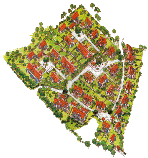 Leitbild für unsere Form von zukunftsfähigen und nachhaltigen Siedlungen ist das Dorf als Lebensraum. Unsere Zeit befindet sich in einem Wandel des Bewusstseins und der Neuorientierung. Auch in der Architektur wird heute vermehrt eine sinnliche Umweltatmosphäre gesucht, in der die Menschen mehr Wärme, Geborgenheit, Schönheit, Gemeinschaft und ein Leben im harmonischen Einklang mit der Natur finden.
